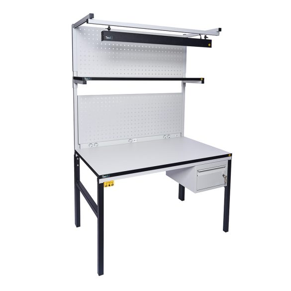 TESDA ESD asztal, 1200x700 mm. 1 db 1200x300 mm-es polccal, 2 db oszloppal, ESD LED lámpával, 2 perforált hátfallal, hálózati elosztóval, 1 fiókos szekrénnyel